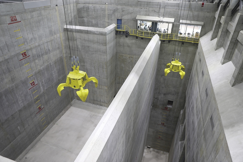 受入ピットに投入されたごみは貯留ピットに貯められ、ごみクレーンでよく撹拌し、ごみ投入ホッパに投入します。