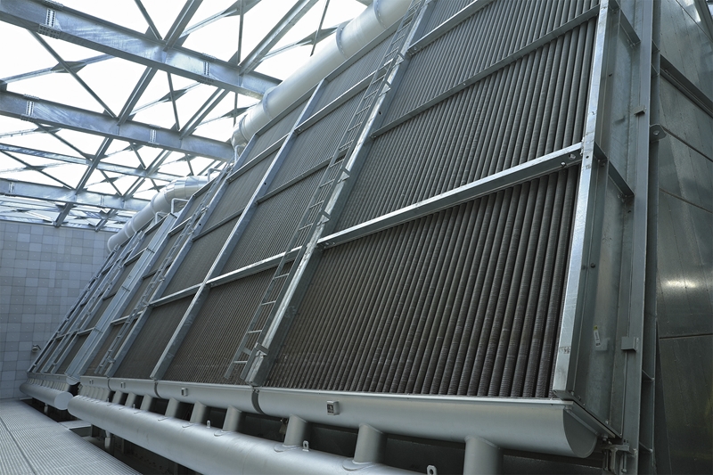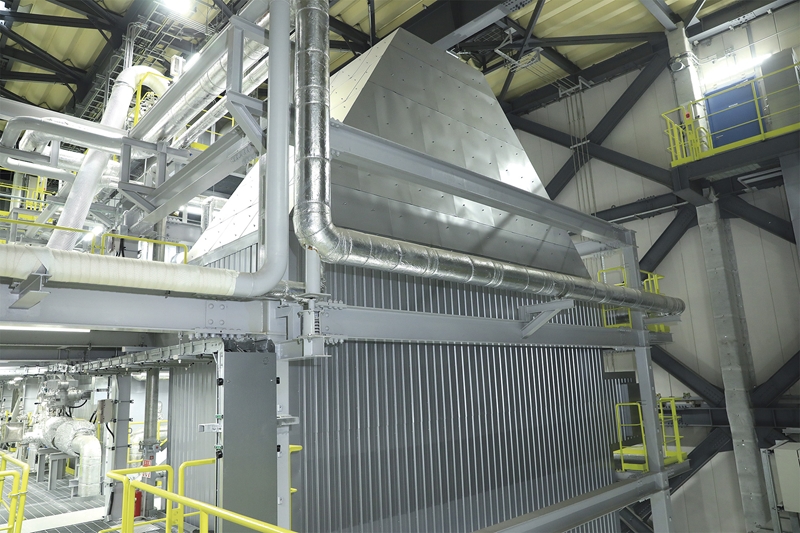 焼却炉から出た高温の排ガスと蒸気復水器から出た水を熱交換し、高温の排ガスを処理に適した温度まで下げます。