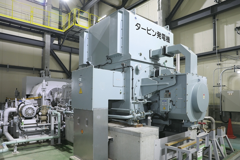ボイラで発生した高温・高圧の蒸気を利用して、タービンを回し、最大7,880kWの発電を行います。発電する電気は、一般家庭10,000戸分の使用量に相当します。