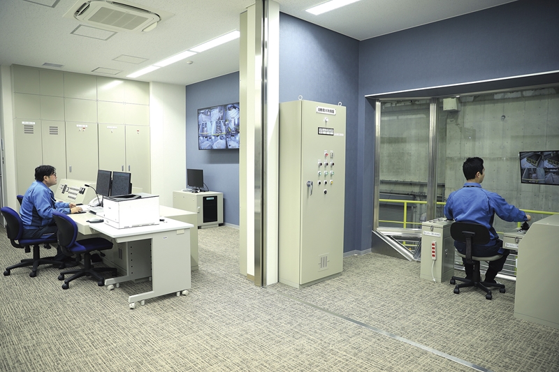 各機器の運転状況を示す計器類や、監視用モニタ等が集められたこの操作室から、集中自動制御します。