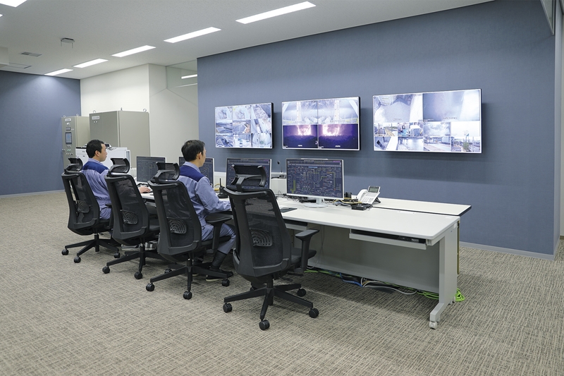 焼却炉の燃焼状況、タービン発電機の発電出力、排ガスの公害監視など、焼却施設内すべての設備の監視、制御を行っています。